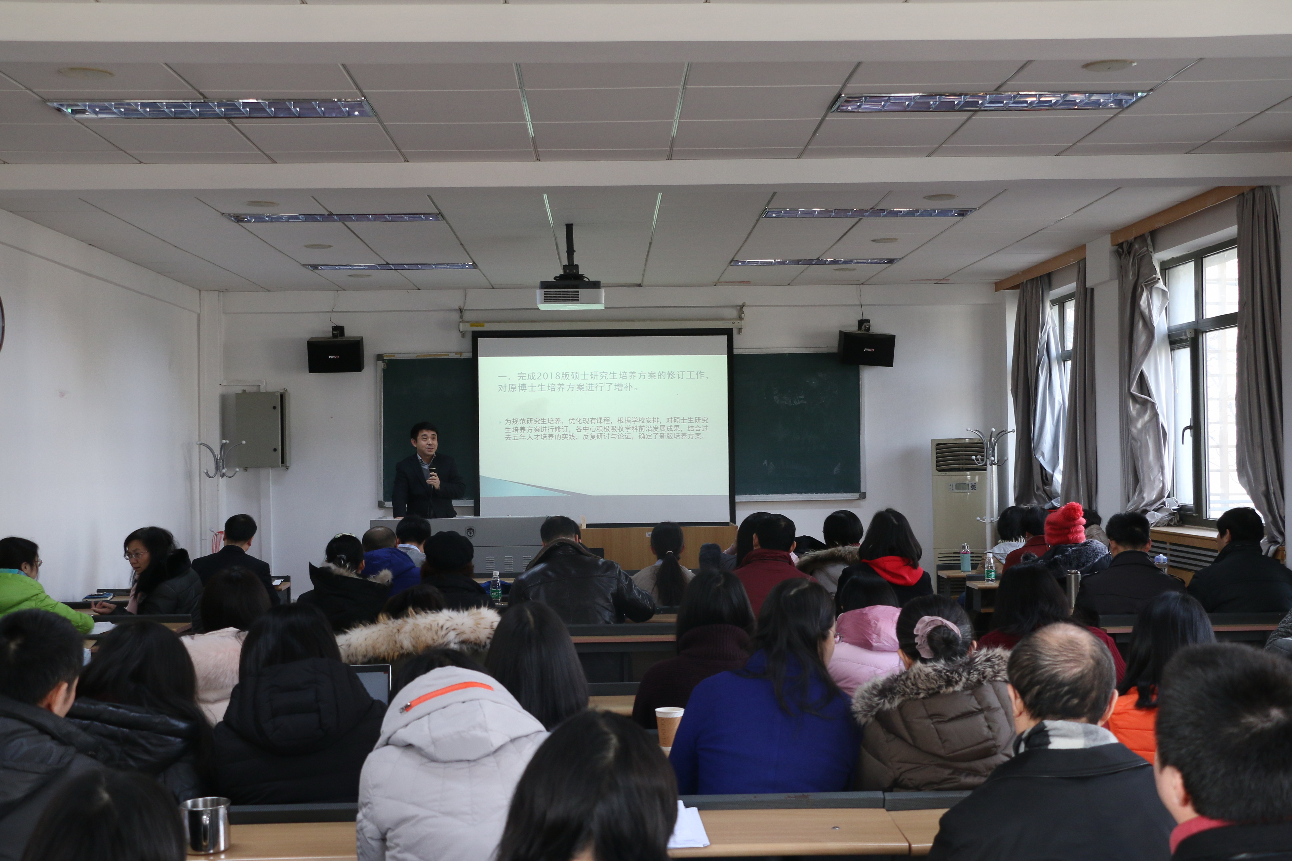 ——会上,分管研究生教学工作的副院长王展鹏教授就本学期研究生工作做了如下总结:一是修订研究生培养方案,使其更加合理和完备;二是改革研究生招生,生源数量和质量都有一定程度的提高;三是各研究中心将讲座、科研立项与研究生培养有机结合,拓展了学生学术视野,提高了学生研究能力及综合素质;四是通过引进高水平专家、鼓励研究生到海外留学等,提高学院研究生教学的国际化水平;五是各中心积极开展学科竞赛,培养创新型人才,人才培养取得诸多新成果;六是丰富办学资源:MTI方向新建同传口译实验室,设立新的奖学金和实习基地,办学资源得到进一步丰富;七是同等学力研修班平稳推进。