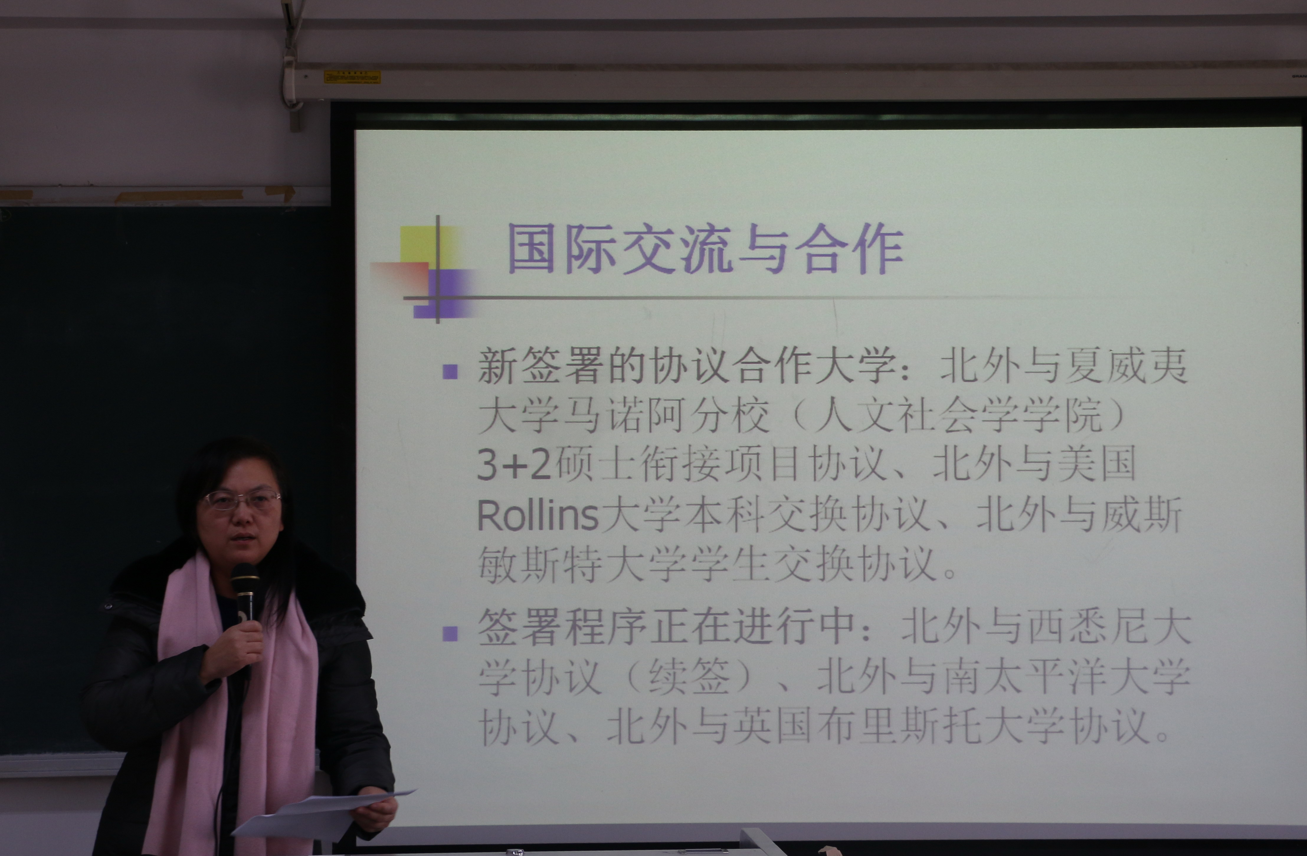 ——分管国际交流与合作的副院长李莉文教授从新签署的合作协议、学生出国留学情况、国家留学基金委优秀本科生项目总结及申请情况、外事接待情况、外国专家聘请,预科班招生培养情况等方面做了总结。