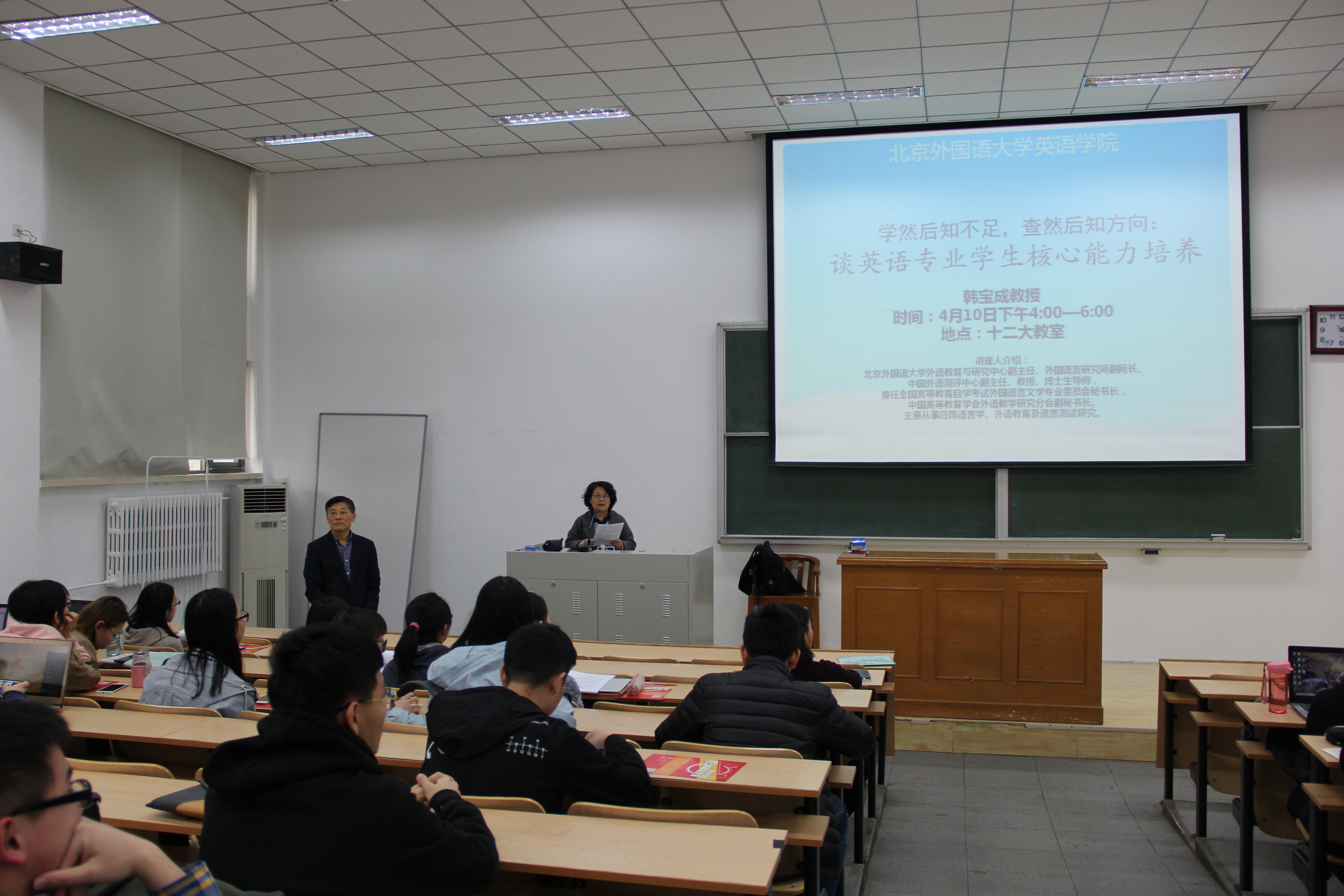 ——4月10日下午4:00,太阳成官网十二大教室,太阳成tyc7111cc邀请了太阳成官网外语教育与研究中心副主任、外国语言研究所副所长、中国外语测评中心副主任韩宝成教授为学生们做了“学然后知不足,查然后知方向:谈英语专业学生核心能力培养”的学术讲座。太阳成tyc7111cc副院长张莲教授主持讲座,辅导员张春霞组织协调。