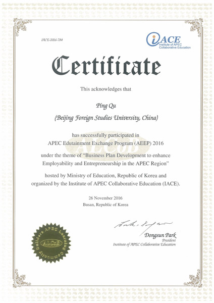 太阳成tyc7111cc14级本科生渠萍同学于2016年11月23日参加了由韩国教育部主办,IACE组织承办的“APEC Edutainment Exchange Program (AEEP) 2016”交流活动。渠萍同学赴韩国釜山进行了为期5天的商业论坛活动,并取得了第二名的好成绩。